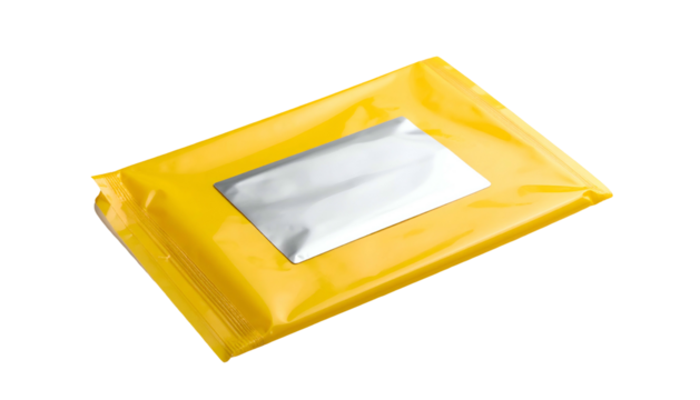 A blank silver foil pouch isolated on transparent background, perfect for packaging mockups and product presentations