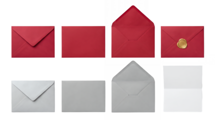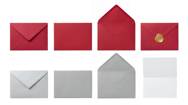 Stationery envelope set including red and silver variants with gold wax seal and blank card isolated. Wedding invitation and greeting collection.