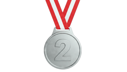 A shiny silver medal hanging from a red ribbon,Transparent background, PNG file