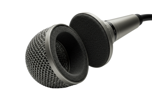 Silver microphone equipment audio sound music voice karaoke recording podcasting broadcasting singing tool on transparent background
