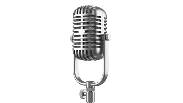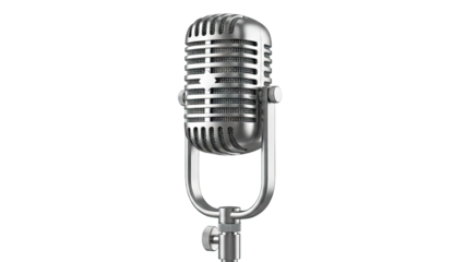 Vintage silver microphone isolated PNG, retro recording equipment for music production and broadcasting on transparent background