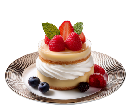 Delicious Dessert: A delectable dessert featuring layers of sponge cake, cream, topped with fresh strawberries, raspberries, blueberries and mint leaves, elegantly presented on a silver plate.