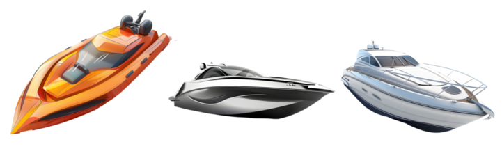 Speedboat, futuristic vessel, and luxury yacht isolated on a white background, png