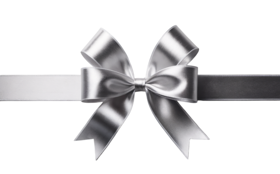 Glittering silver ribbon bow, horizontal orientation on a transparent background, PNG image, PNG file.
