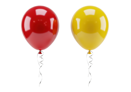A pair of hyperrealistic, glossy candy apple red and sunny yellow spherical balloons with silver ribbons floating against a transparent studio background, concept for a celebration visualization
