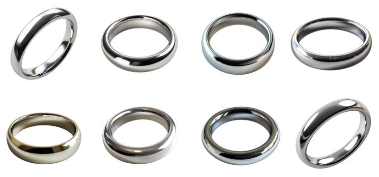 Set of 3D Rendered Silver Rings with Shiny Chrome Finish on Transparent Background, Ring Cutout, Ring PNG