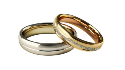 Intricately patterned rose gold and silver rings, featuring crisscross diamond accents for a touch of vintage romance and contemporary charm. Isolated on a transparent background