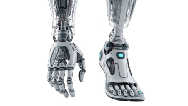 Integrated silver robotic hand and foot prosthesis set with turquoise interface pads, articulated toes and exposed leg mechanisms, showcasing unified next generation full-limb reconstruction technolog