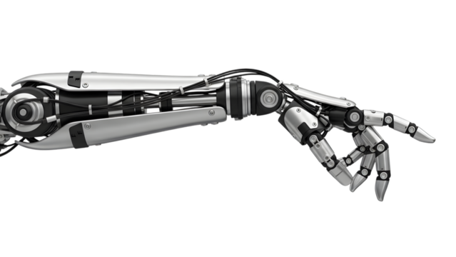 Robotic arm with metallic fingers and joints in a detailed mechanical isolated on a transparent background
