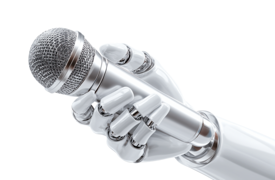 Highly detailed, futuristic 3D images of a glossy white robotic or cyborg hand holding a dynamic microphone on a transparent background