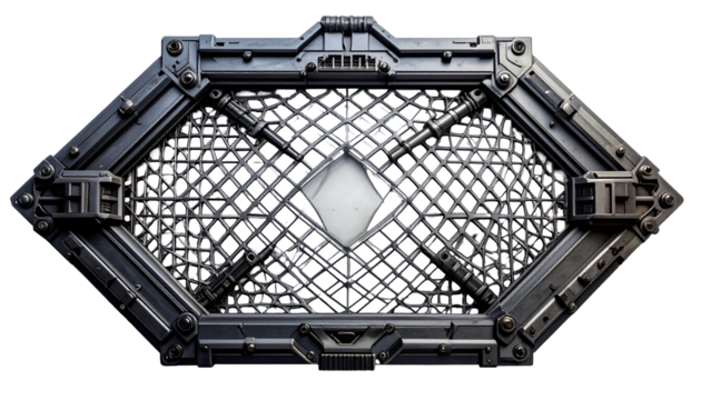 Metallic diamond-shaped structure with intricate inner lattice and central glow