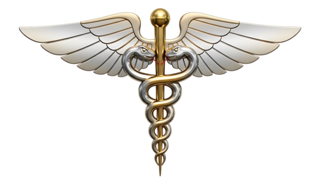 A silver caduceus medical symbol isolated on transparent background