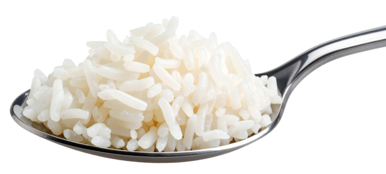 closeup of a silver spoon of rice isolated on white background