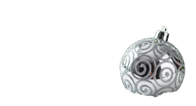 Macro shot of a detailed silver christmas ball with glitter pattern on a bed of fluffy snow with a blurred fir branch. Serene festive holiday concept