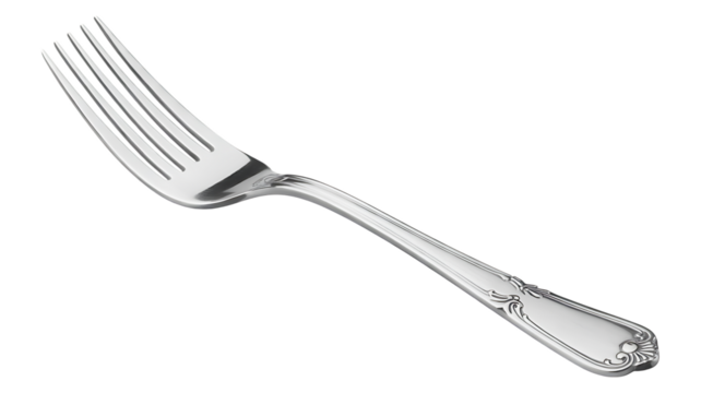 silver dinner fork with elegant decorative patterns lies diagonally, perfectly image isolated on a transparent background