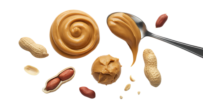 A luscious peanut butter spread with roasted peanuts and a silver spoon promising a creamy and on transparent background
