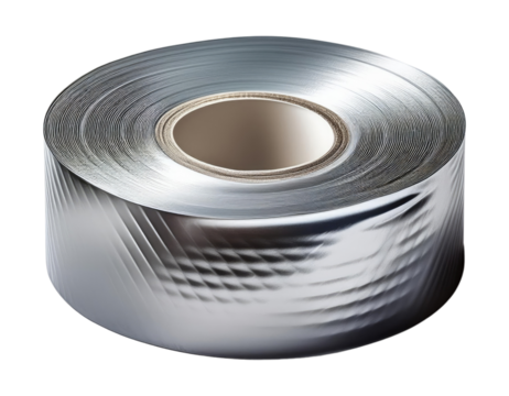 Close-up of a roll of silver tape with a cardboard core, presented against black
