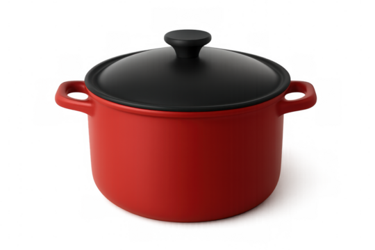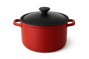 Red ceramic cooking pot with black lid, isolated on transparent background, ideal for showcasing cooking or kitchen concepts