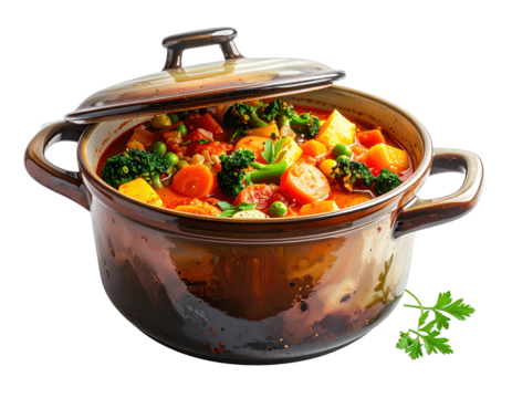 Rustic copper pot with steaming red stew on transparent background