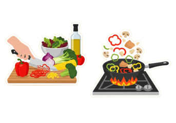 Preparing a healthy meal with fresh vegetables being chopped on a cutting board and cooked in a pan on a gas stove