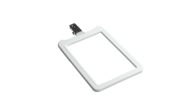 Isometric view of an empty white ID badge with metal clip, on black background