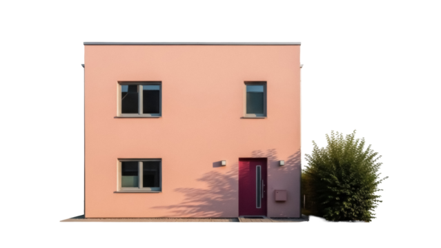 Modern pink house with red door isolated PNG on transparent background, contemporary architecture with windows and green bush, real estate design