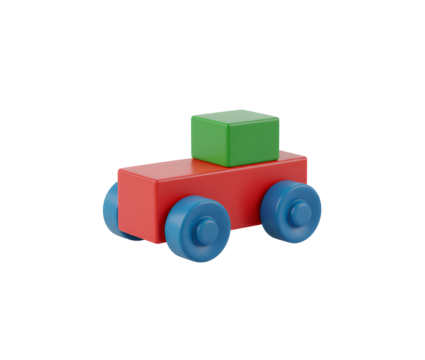 A simple red toy car with blue wheels and a green block on top, isolated on transparent background