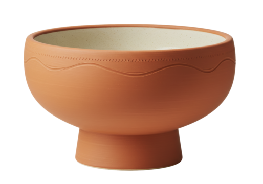 Isolated terracotta bowl, simple round vessel with base. Natural clay pot, house decor