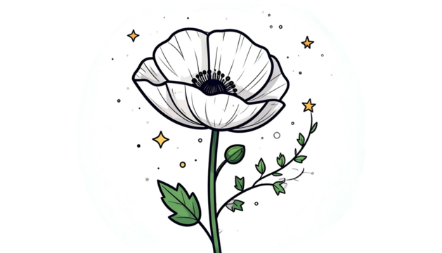 A white flower with black center and green stem encircled, adorned with stars and leaves