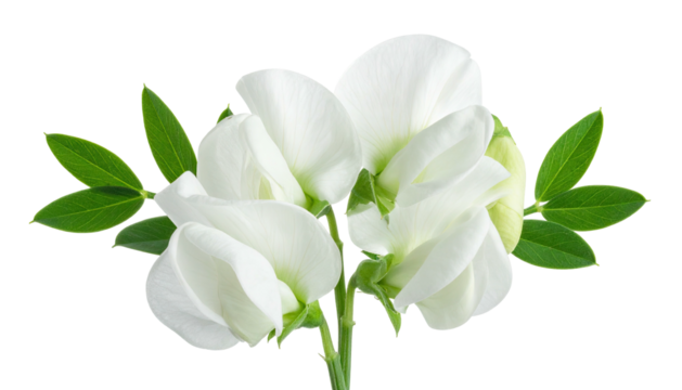 Close-up of delicate white flowers with green leaves, black background