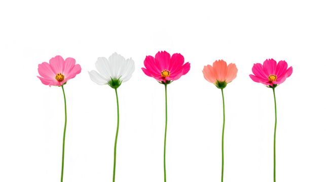 Five colorful cosmos flowers with long green stems isolated on transparent background, showing pink, white, magenta, orange, and red petals, creating cheerful and vibrant floral arrangement