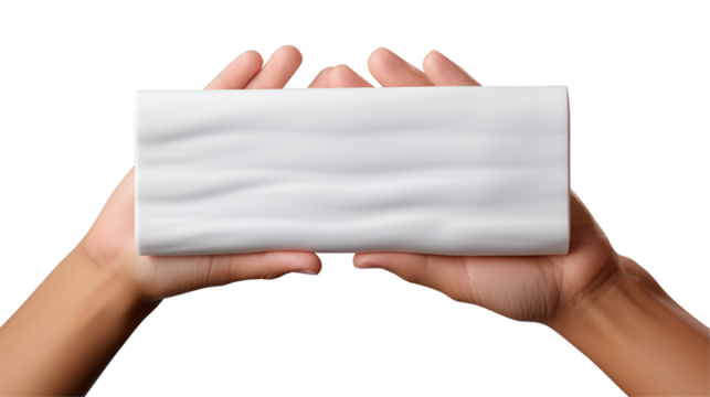 White fabric drape mockup with soft texture, held by hands, ideal for minimalist product presentations, transparent background.