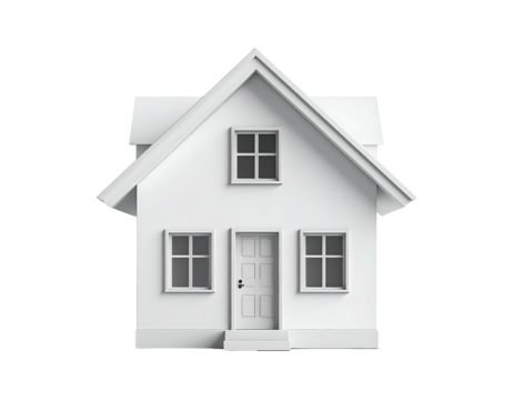Front-facing, clean, white, two-story house model with a simple, symmetrical design