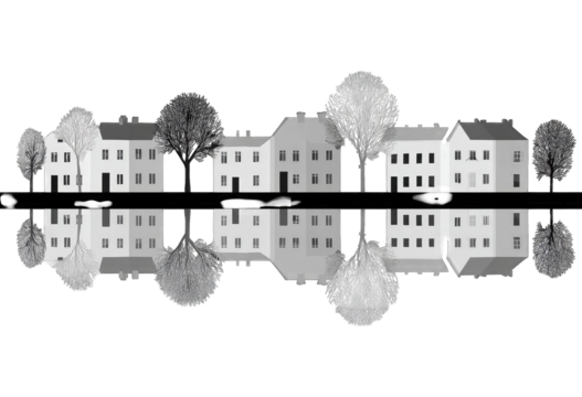 Line of flat design houses depicting a cozy residential street, conveying themes of village life, real estate, and property