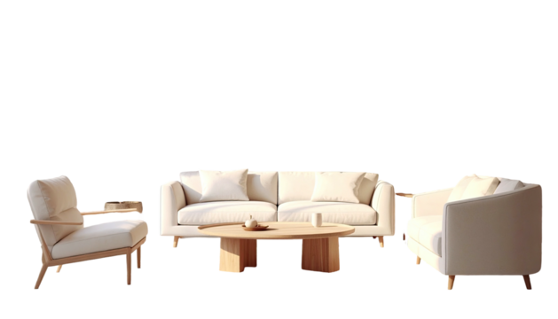 Comfortable yellow corner sofa with multicolored cushions and a wooden coffee table on white background for living