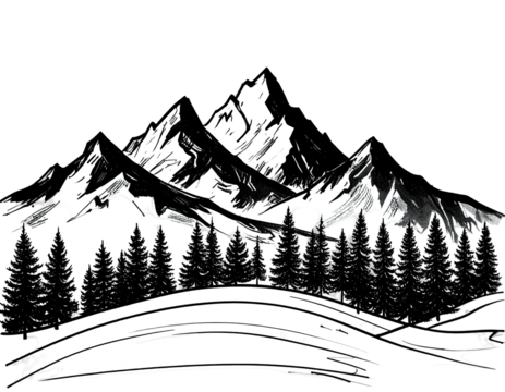 Black and white illustration of snow-capped mountains and evergreen trees in landscape setting