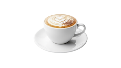 Detailed view of a coffee cup with latte art, placed on a white saucer, standing out against a stark white background for a simplistic elegant design