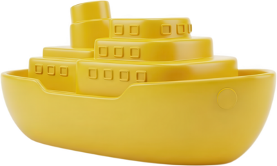 Bright yellow toy cruise ship with multiple decks and square windows presented as a clean 3D render boat vessel cheerful simplistic object design element transportation nautical transparent background