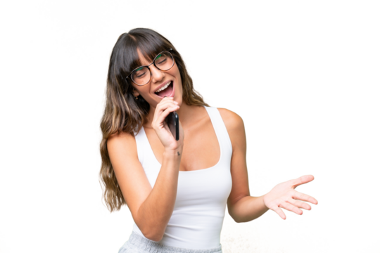 Young caucasian woman over isolated background using mobile phone and singing