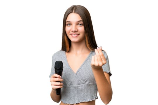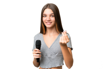 Teenager singer girl picking up a microphone over isolated background making money gesture