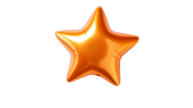 A shimmering orange star shaped balloon isolated against a stark black background in studio lightisolated on transparent background