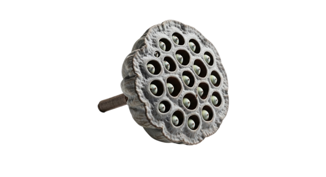 A single dried lotus seed pod, showcasing its natural texture and the pattern of its seed cavities, isolated on transparent background