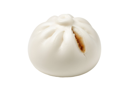 Close-up shot of a single, perfectly steamed dumpling with delicate pleats, placed in the center of a white background.