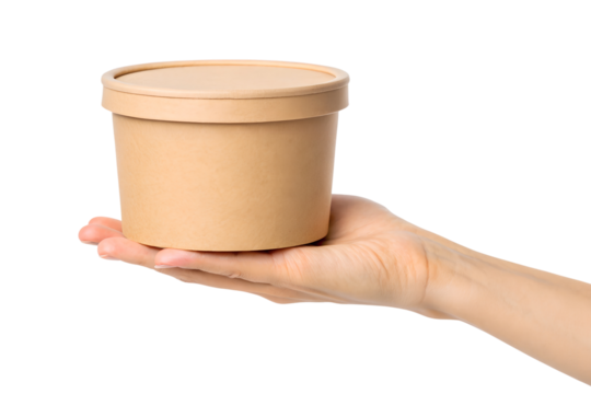 A single hand presents a simple blank brown paper food container with a matching closed lid, isolated on a transparent background, png.