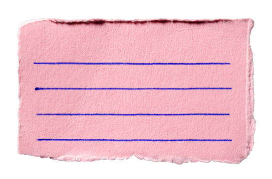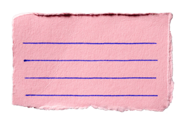 Piece of blank sticky ruled pink paper note with rough texture and lines for copy space for text, isolated cut out transparent png background design element