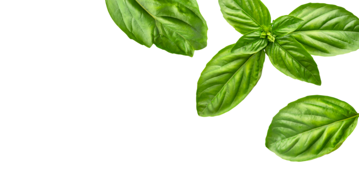 Flying fresh green basil leaves isolated on white background. Cut out contour basil leaves, objects for your packaging design, advertising, mockup. With clipping path
