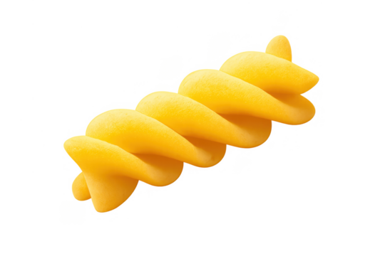 Fusilli pasta piece, a yellow dry uncooked food ingredient, showcasing its spiral shape. Transparent background