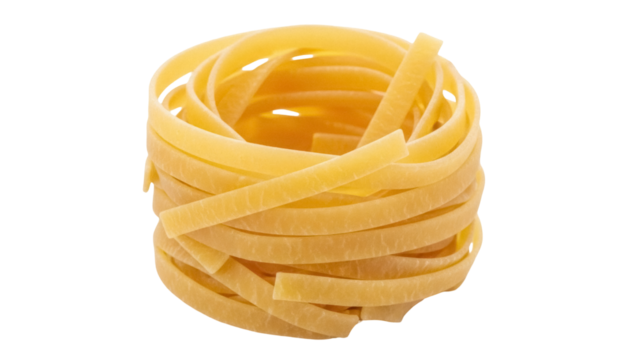 Dried tagliatelle pasta nest isolated PNG on transparent background, uncooked Italian fettuccine food ingredient for gourmet cooking