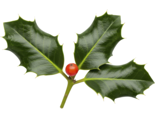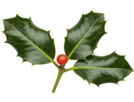 Fresh Christmas holly sprig with vibrant green leaves and a single red berry on a transparent background, PNG image