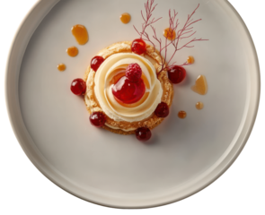 Strawberry cheesecake with red berry glaze on a white plate isolated on a transparent background